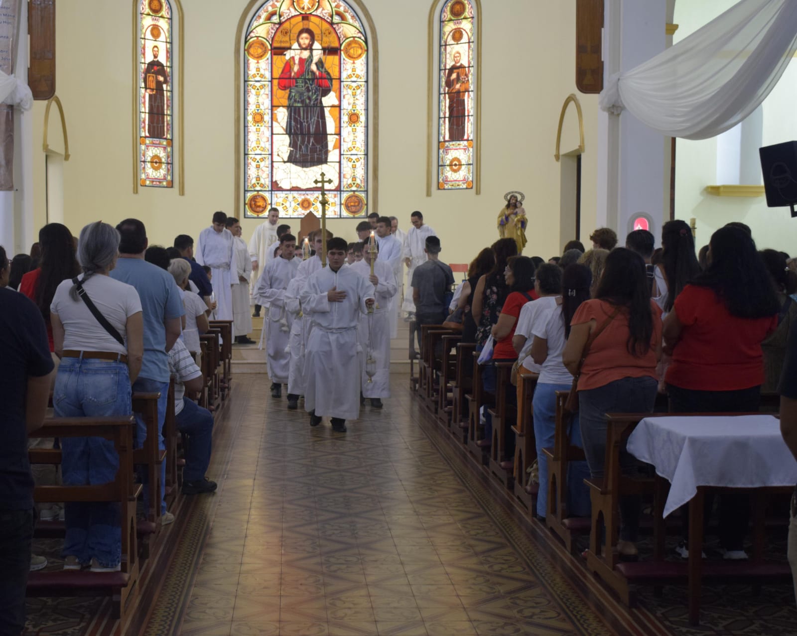 Al llegar a la zona peatonal frente a la Iglesia Catedral, todo se acomodó para la celebración de la Santa Misa. La multitud se aprestó a ocupar los lugares en los asientos de la parroquia que fueron ubicados sobre la plaza, en los espacios disponibles por el predio y hasta en las propias sillas de quienes se acercaron al lugar con ellas.